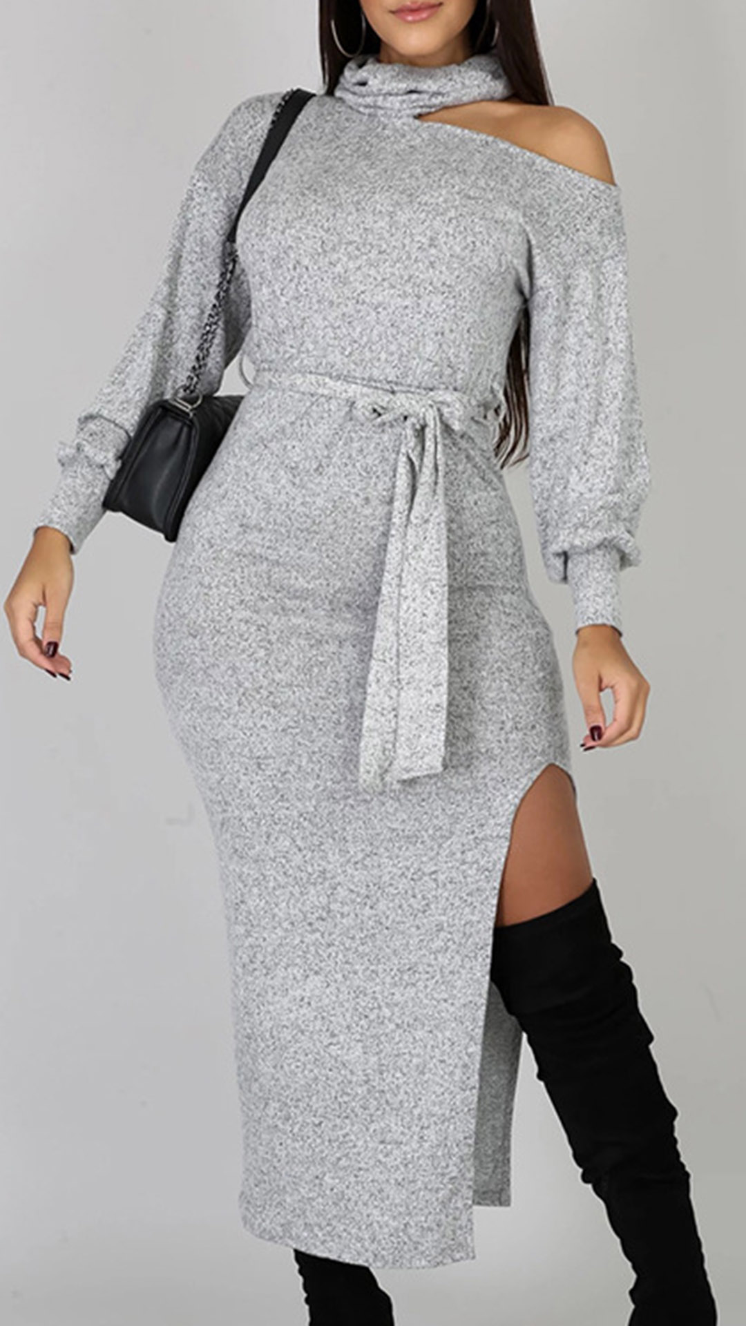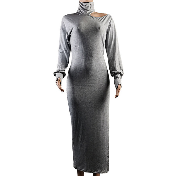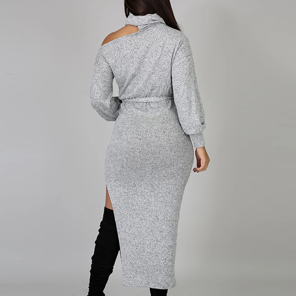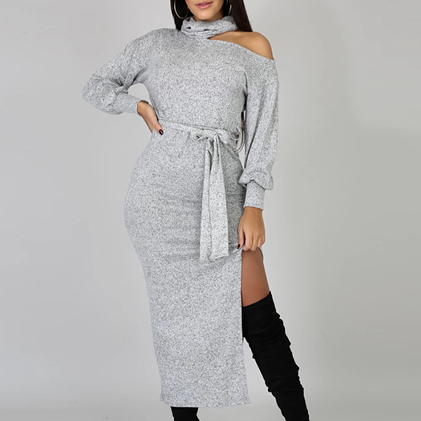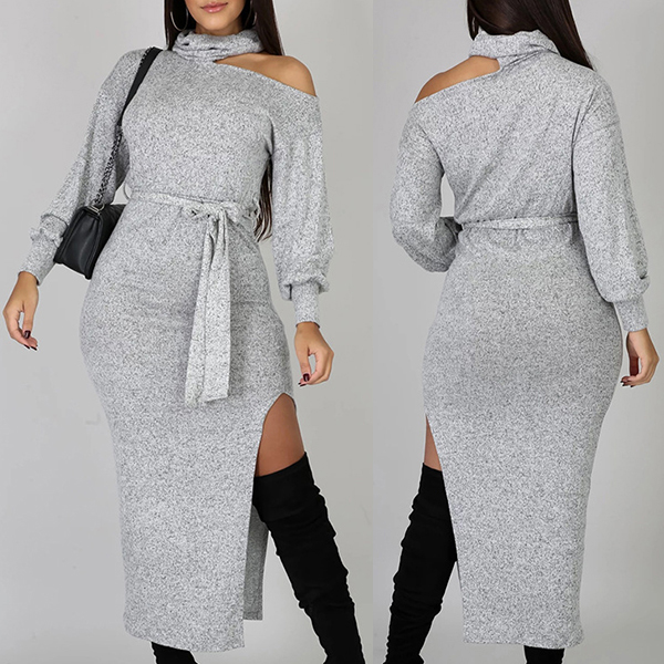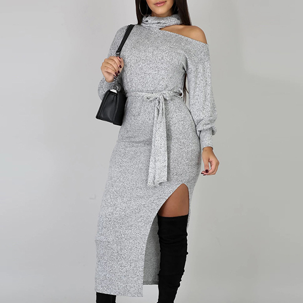 Your style can have an update by wearing this knit dress. The unique off-shoulder,high collar and slit hem design make this piece look so distinctive and attractive. And the fit silhouette design can better showcase your slender figure. For your spring and autumn days,this piece can be your wise choice.