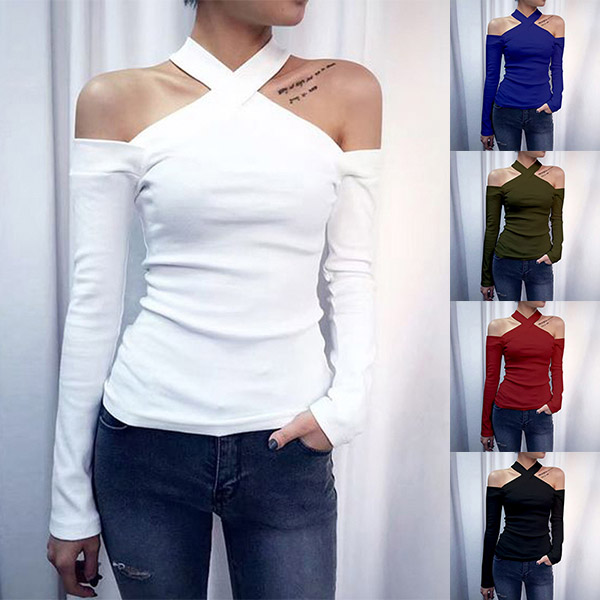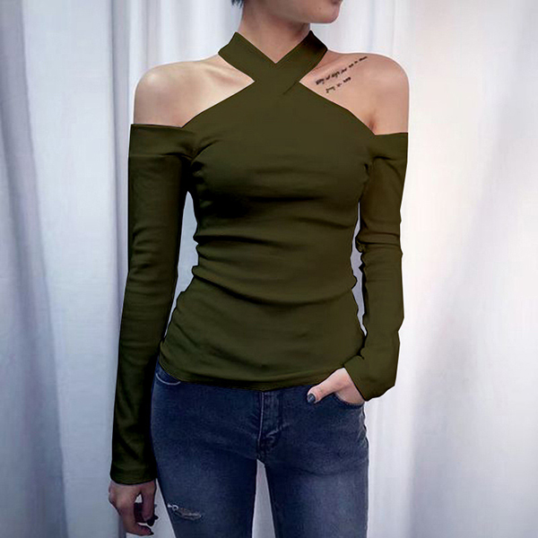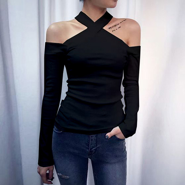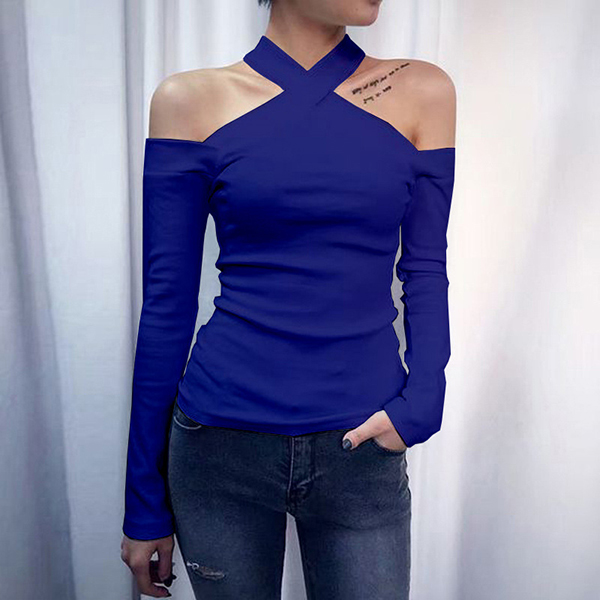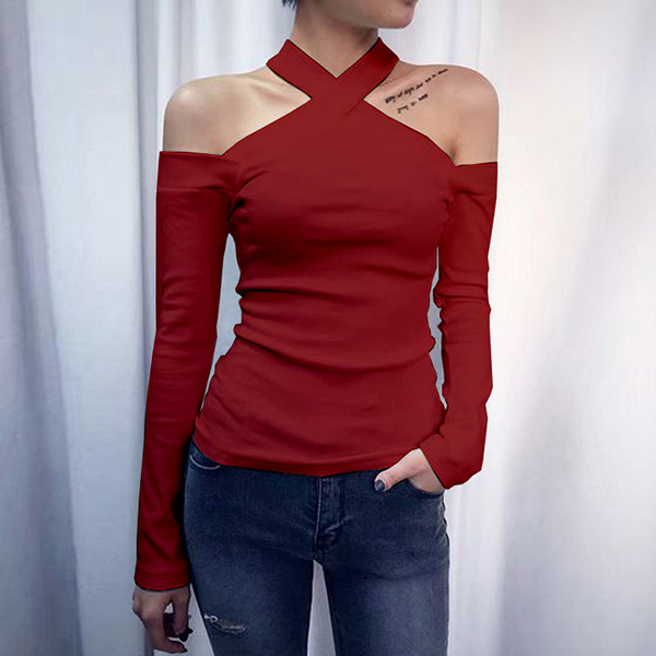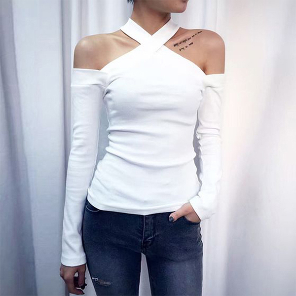 Sexy Off-shoulder Long Sleeve Solid Color Slim Fit T-shirt