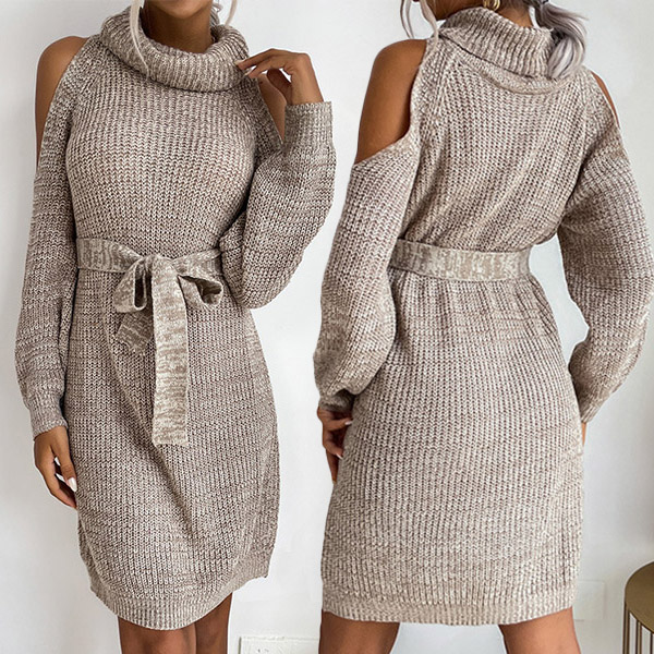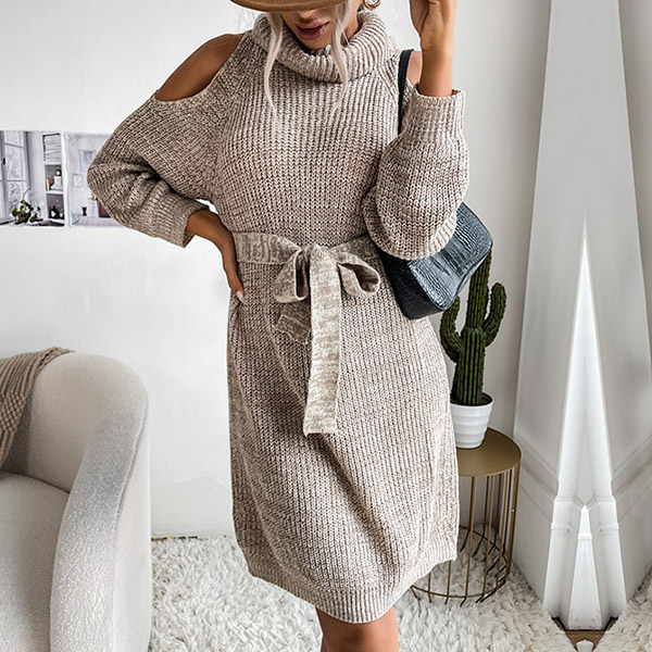 Sexy Off-shoulder Long Sleeve Turtleneck Solid Color Tie-belt Sweater Dress