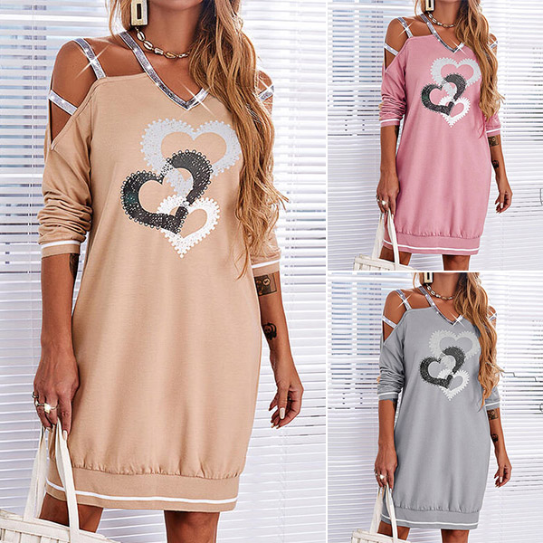 Only need one glance,you would be attracted by this chic and stylish sweatshirt dress. The off-shoulder and v-neck design can showcase your sexy and flirty vibes. Moreover,the hear pattern and sequin details will further enhance its charm. For your casual autumn days,this piece can be your wise choice.