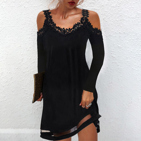 Sexy Off-shoulder Long Sleeve V-neck Lace Spliced Solid Color Dress