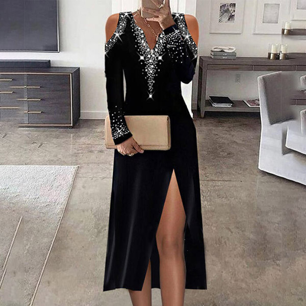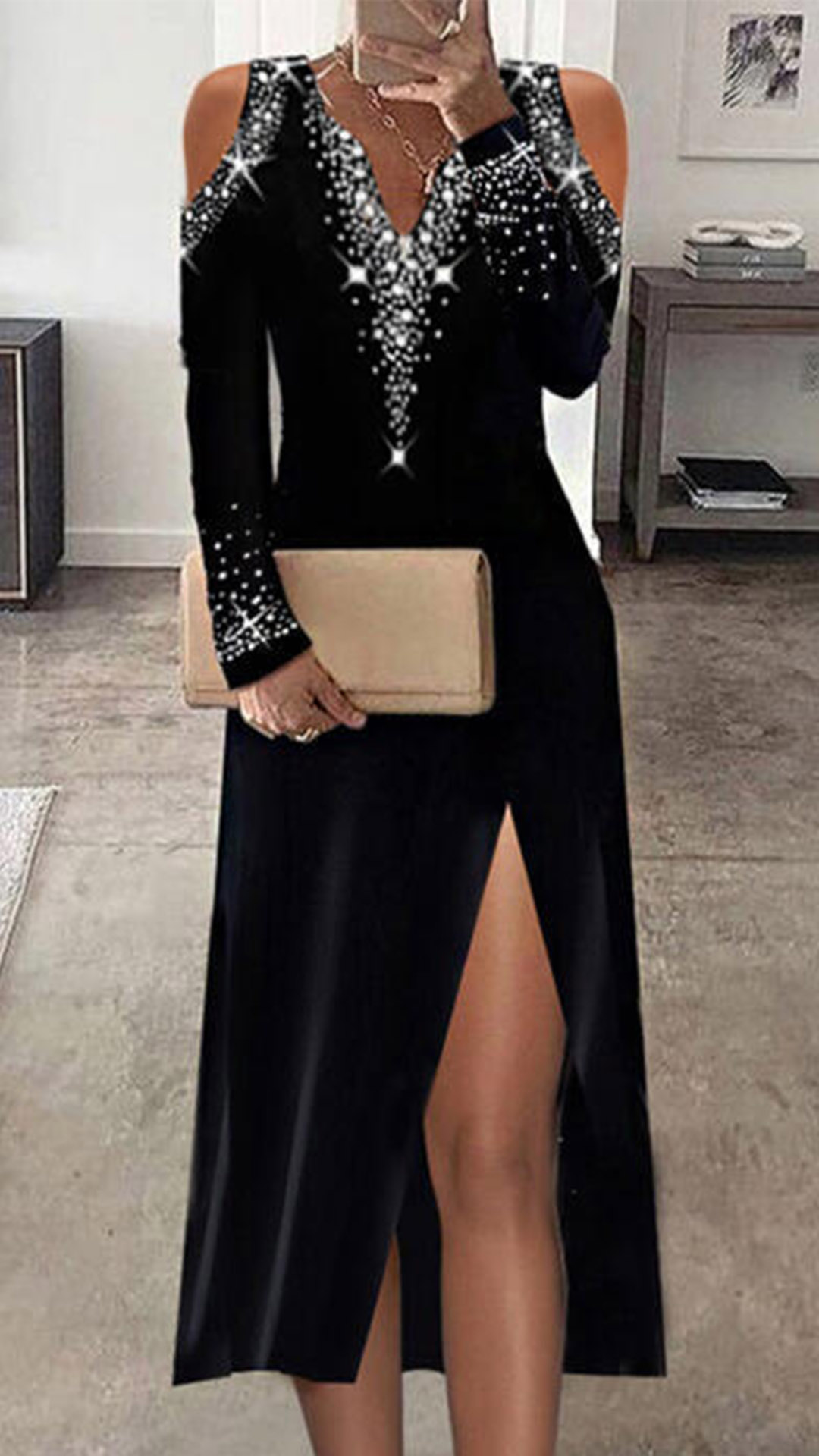 Sexy Off-shoulder Long Sleeve V-neck Slit Hem Rhinestone Spliced Party Dress