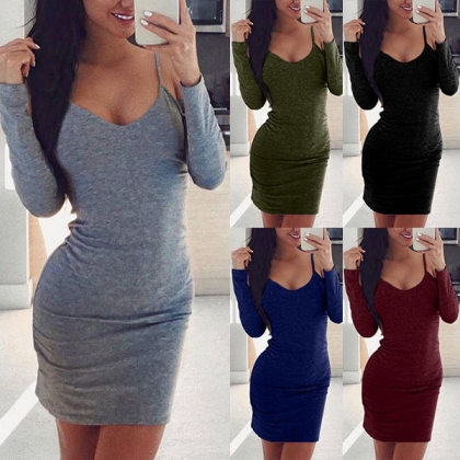 Sexy Off-shoulder Long Sleeve V-neck Solid Color Slim Fit Sling Dress