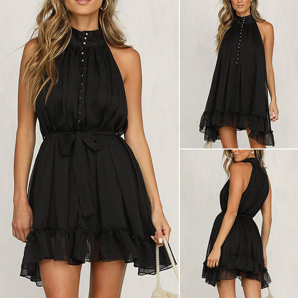 The dress boasts a classic yet stylish black tone,the off-shoulder,mock neck and ruffle hem design will lend you a dash of sweet,flirty and stylish vibes. The soft fabric and loose silhouette design can offer you a comfortable day. We suggest you matching with a thin waistband to achieve for a more beautiful look!