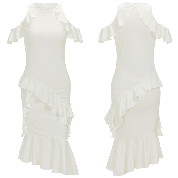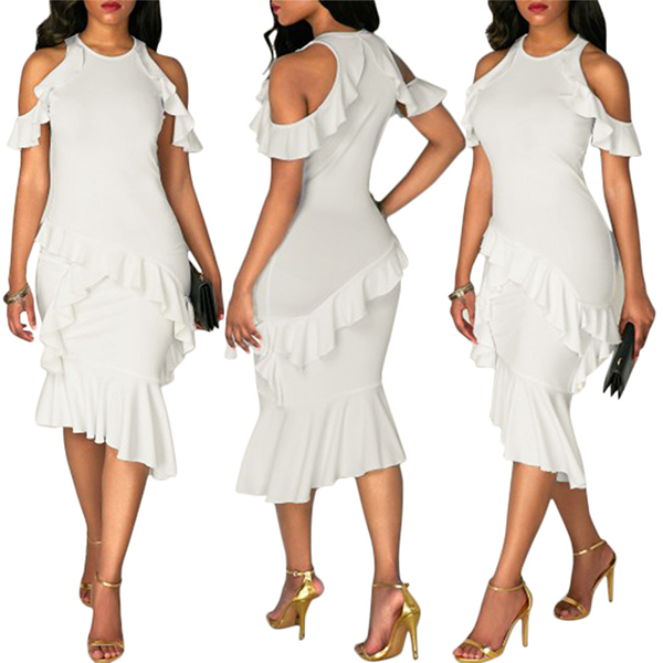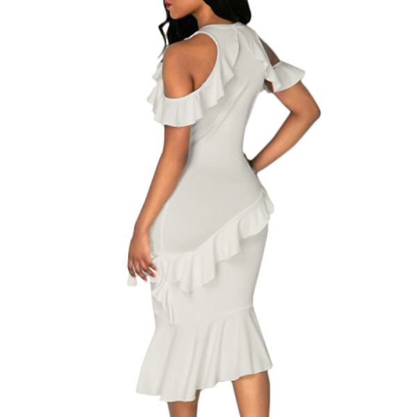 its stunning details like off-shoulder,fishtail hem and ruffle design make this piece look so appealing and sexy.