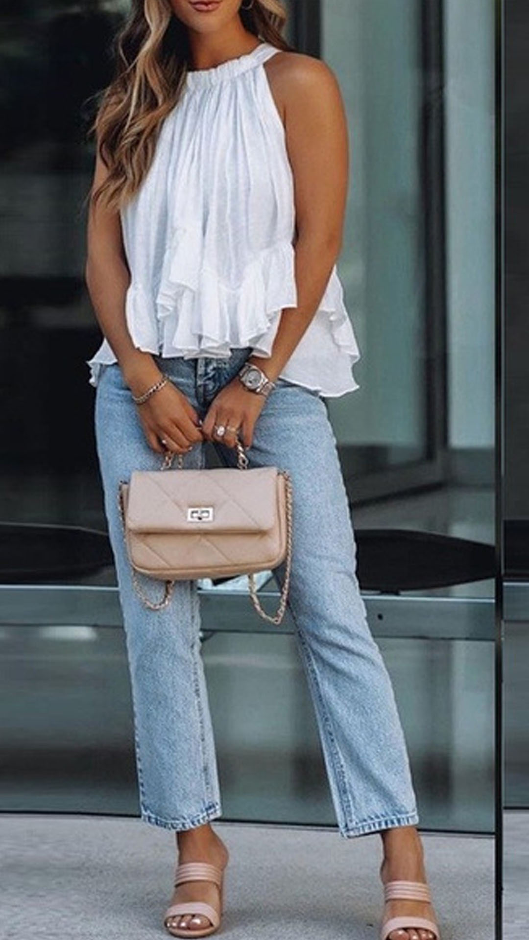 Hey,girls,you can greet the sun-soaked summer days with this wonderful piece. The off-shoulder and ruffle hem design make this piece full of sweet and stylish vibes,while the off-shoulder design can lend you a dash of sexy and flirty vibes. We suggest you matching with a high waist tight pants to start your wonderful day.