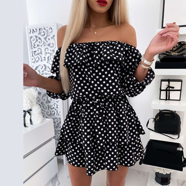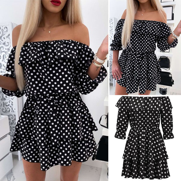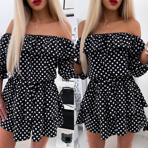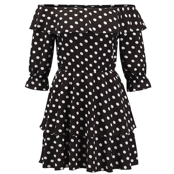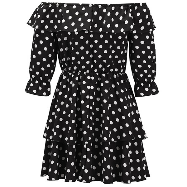 Wanna your dating look that is full of sweet and feminine vibes,then we suggest you choosing this dress. The dots printed details can make you look playful and eye-catching,while the off-shoulder and boat neck design will make you look sexier. When adding a sparkle choker necklace,you can look more beautiful!