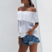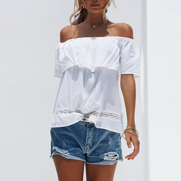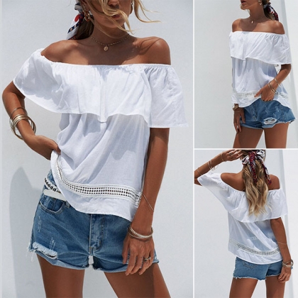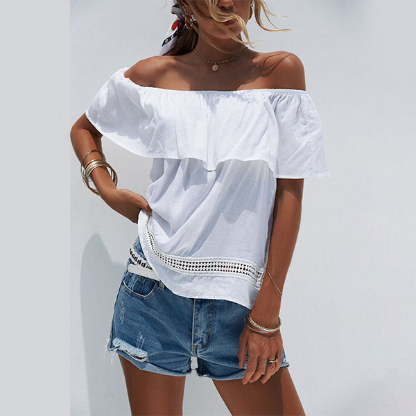 This wonderful top boasts a classic yet stylish white tone,the off-shoulder and ruffle boat necklace design can lend you a sexy and flirty look. If you wanna look more beautiful,we suggest you adding a choker necklace.