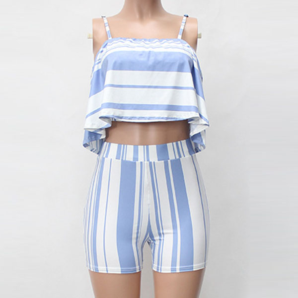 Striped style,including an off-shoulder ruffle cami top and a high waist shorts,this two-piece set is also a good way to accentuate