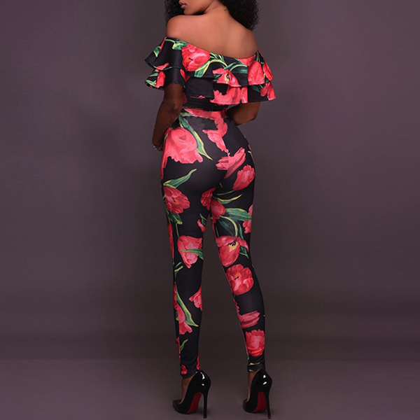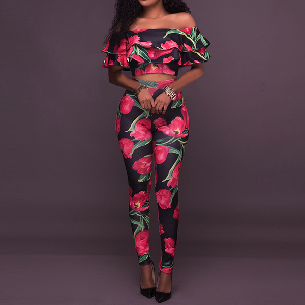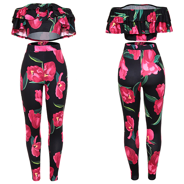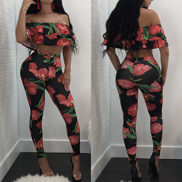 Consists of an off-shoulder wide neckline ruffle crop top and a high waist tight pants,this two-piece set is sure to demonstrate