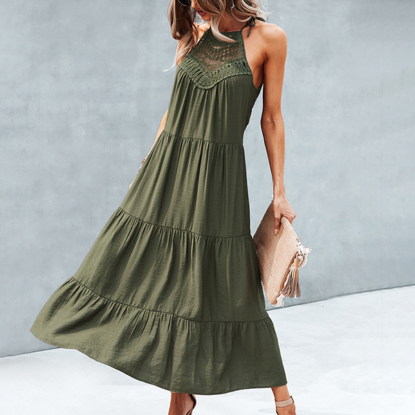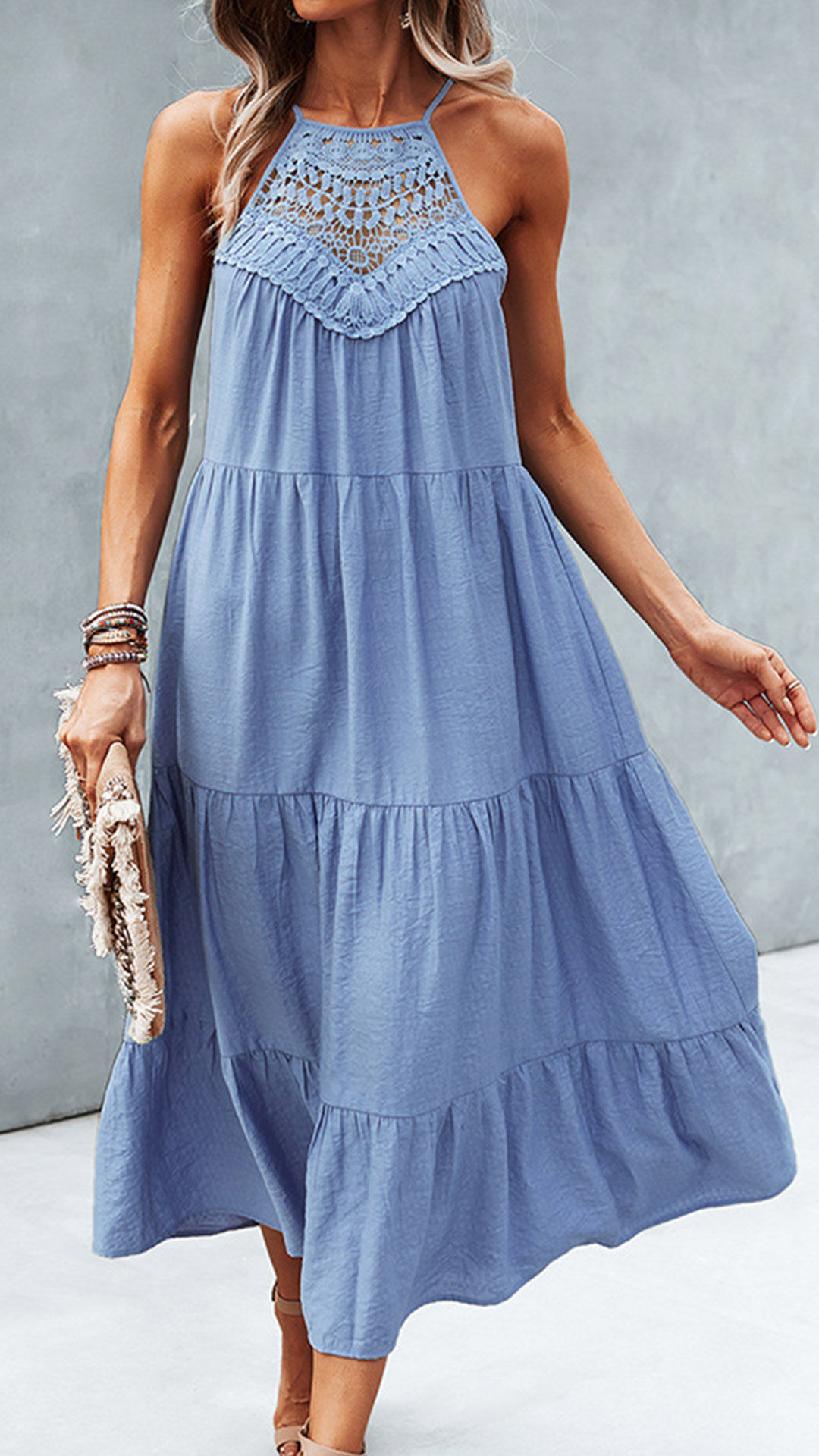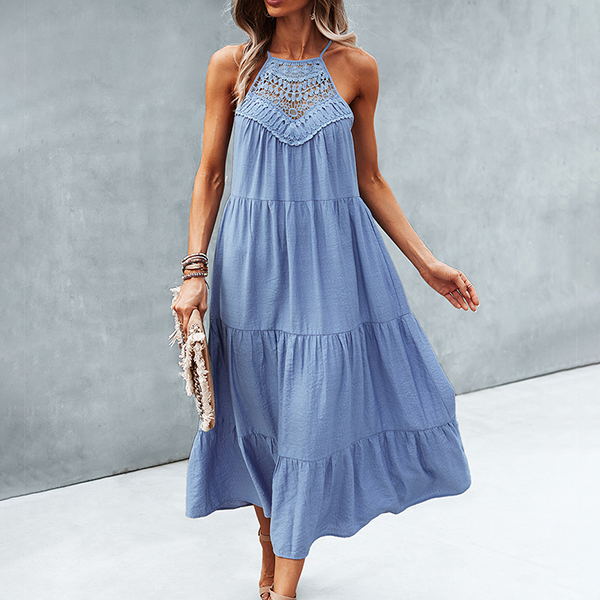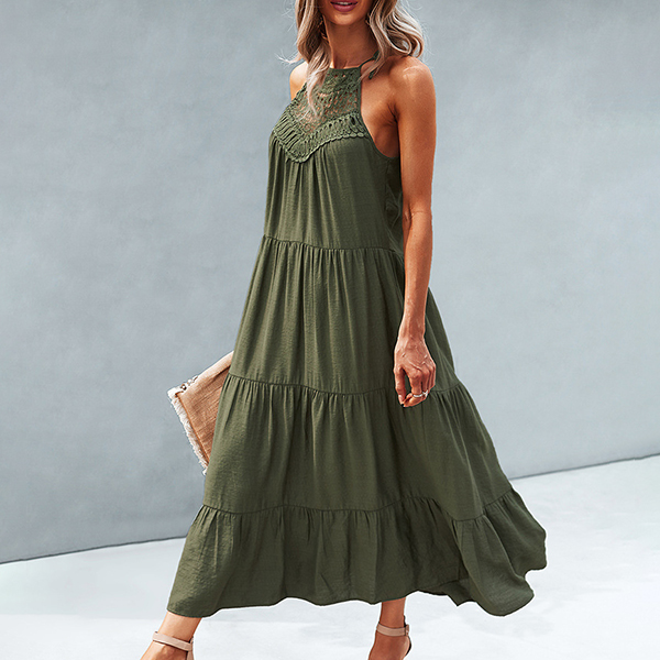 Hey,girls,you can greet the sun-soaked summer days with a dreamy and relaxed piece such as this dress. Sling style,the off-shoulder and lace spliced details will make this piece fill of sexy and flirty vibes,while the ruffle hem design can lend you a dash of sweet vibes. On these sunny days,adding a sweet straw hat would make you look more perfect!