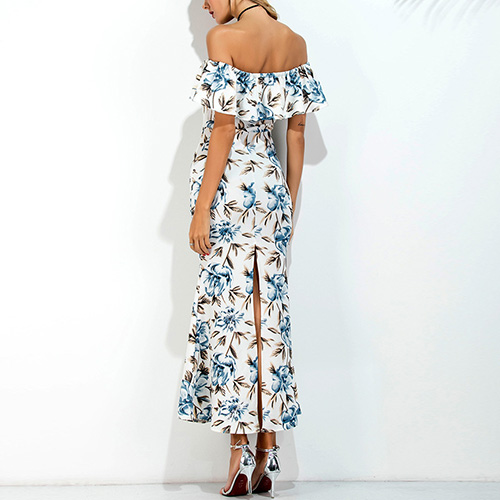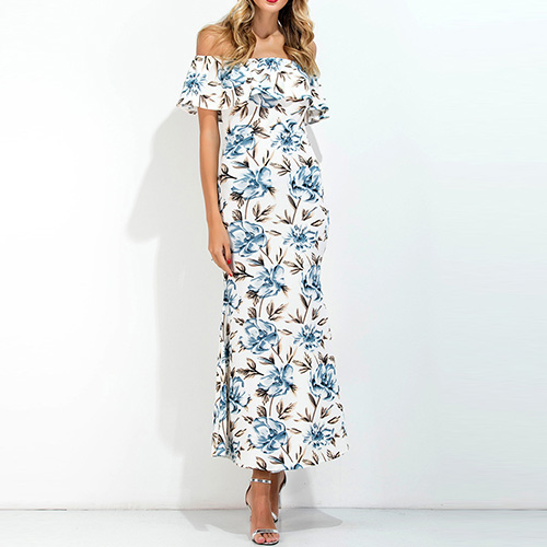 This simple and charming maxi dress in a vibrant floral print makes you look effortless charming. Its off-shoulder neckline with ruffle design