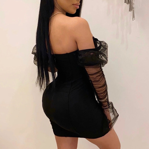 Sexy Off-shoulder See-through Gauze Spliced Long Sleeve Slim Fit Party Dress