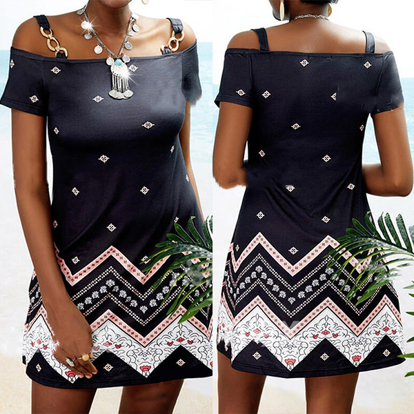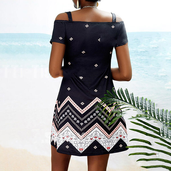Sexy Off-shoulder Short Sleeve Chain Sling Printed Dress