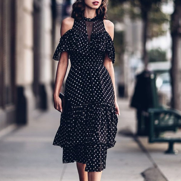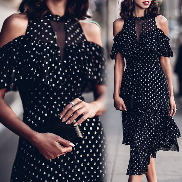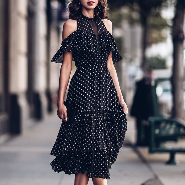 Create a sassy look with the flirty details of this dress. The dots printed details make this piece full of playful and charming vibes,while the off-shoulder and ruffle design will offer you a sexier look. For your daytime out and night dating,this beautiful dress can be your wise choice.