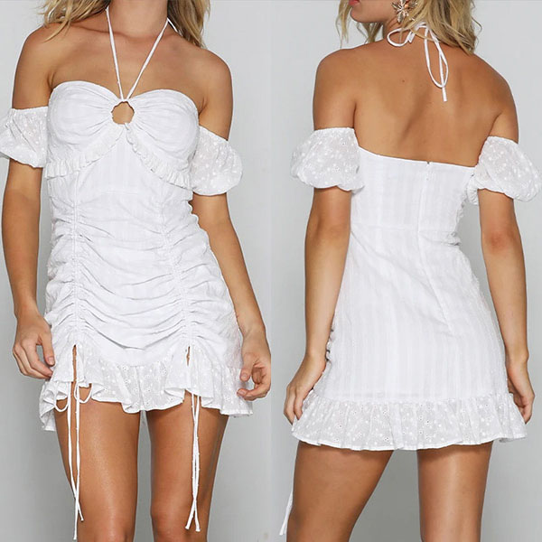 It is an easy thing to create a sassy and flirty look with the help of this dress. The unique halter style,drawstring and off-shoulder design make this piece look so distinctive and seductive. When you wear it,you can draw more eyes.