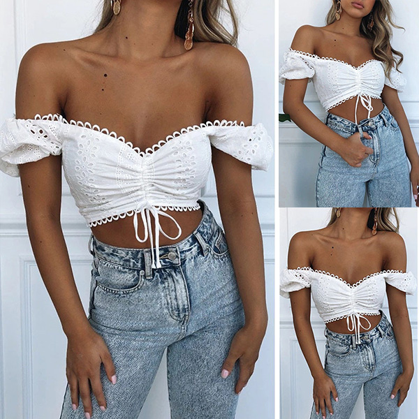 Hey,girls,you can start your wonderful day from this little stunner. Solid color style,the off-shoulder boat neck and hollow out details make this piece full of sexy and flirty look. So why not match with your high waist shorts and sparkle choker necklace to achieve for a beautiful look?