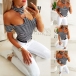 Sexy Off-shoulder Short Sleeve Metal Ring Halter Striped T-shirt