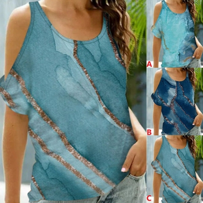 Sexy Off-shoulder Short Sleeve Round Neck Tie-dye Printed Loose T-shirt