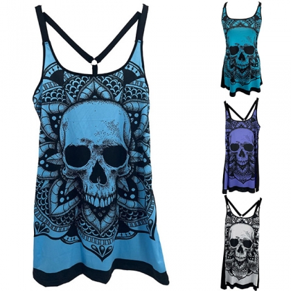 Sexy Off-shoulder Short Sleeve Skull Printed Beaded Halter T-shirt