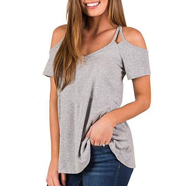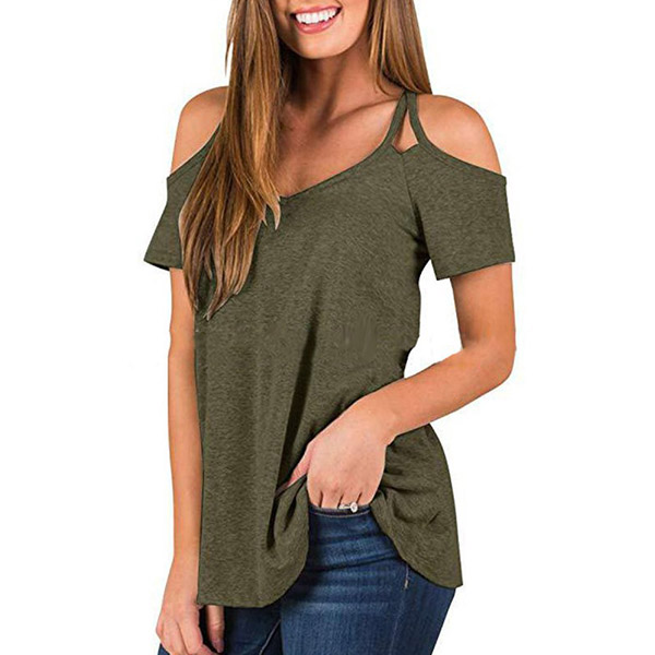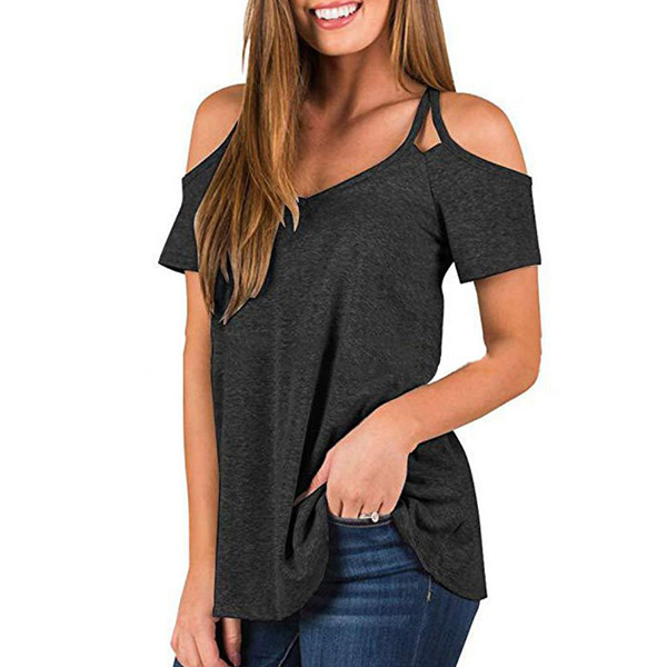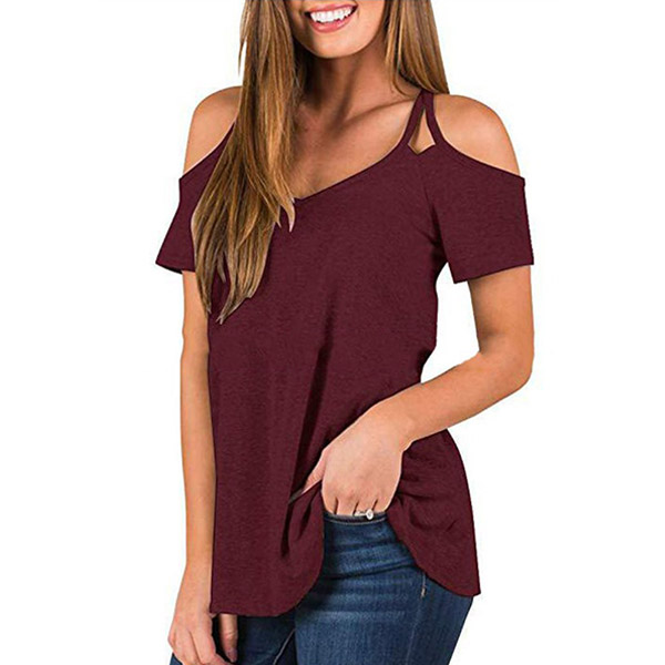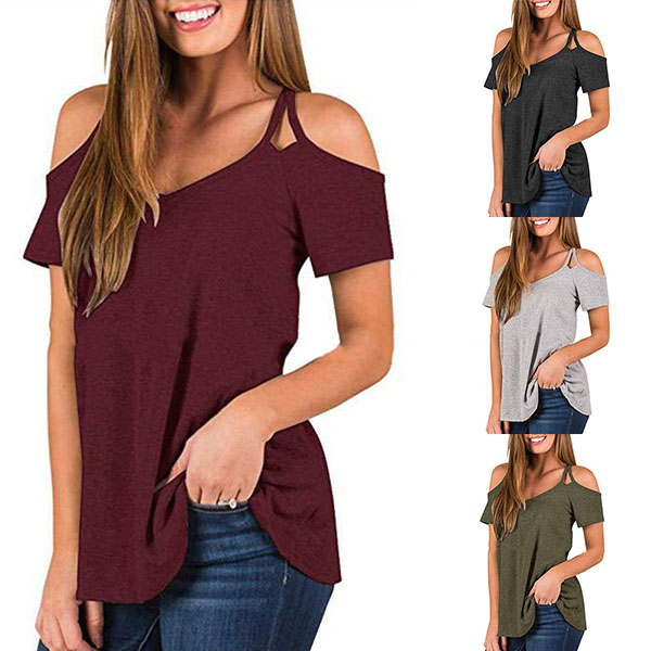 This t-shirt that combines of cozy,sexy and flirty vibes is worth to arouse your attention. Solid color style,the off-shoulder and v-neck design can lend you a sexier look. Crafted from soft and breathable fabric,this short-sleeved t-shirt is worth to be your wardrobe staple in these summer days.