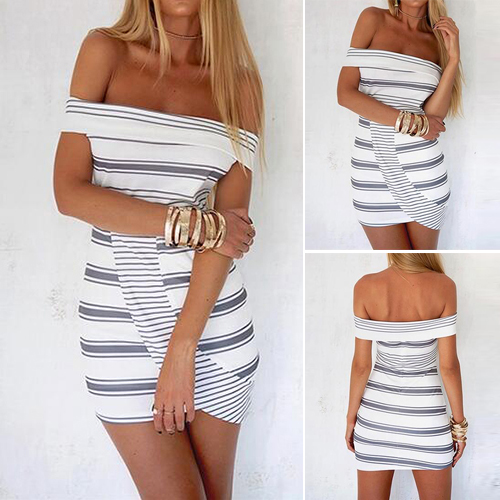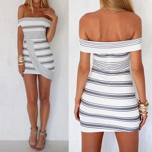 Sexy Off-shoulder Slash Neck Irregular Hem Slim Fit Striped Dress