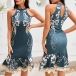 Sexy Off-shoulder Sleeveless Fishtail Hem Slim Fit Printed Dress