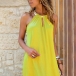 For your summer days,you need a relaxed and dreamy dress to accompany you. So how about this piece? The off-shoulder design can lend you some sexy and flirty look,and the unique halter style can help you draw more attention. Different colors for your optional.