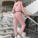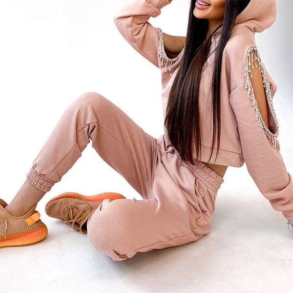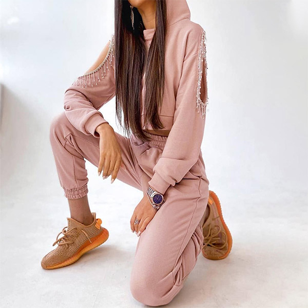 Hey,girls,you can trust in this two-piece set to update your style and charm. Comes with a sweet pink,including a long sleeve hooded crop top and an elastic waist pants,its soft and breathable fabric can give you a comfortable day. Moreover,the off-shoulder and tassel details will further enhance its charm. Your perfect choice for your casual daily wearing.