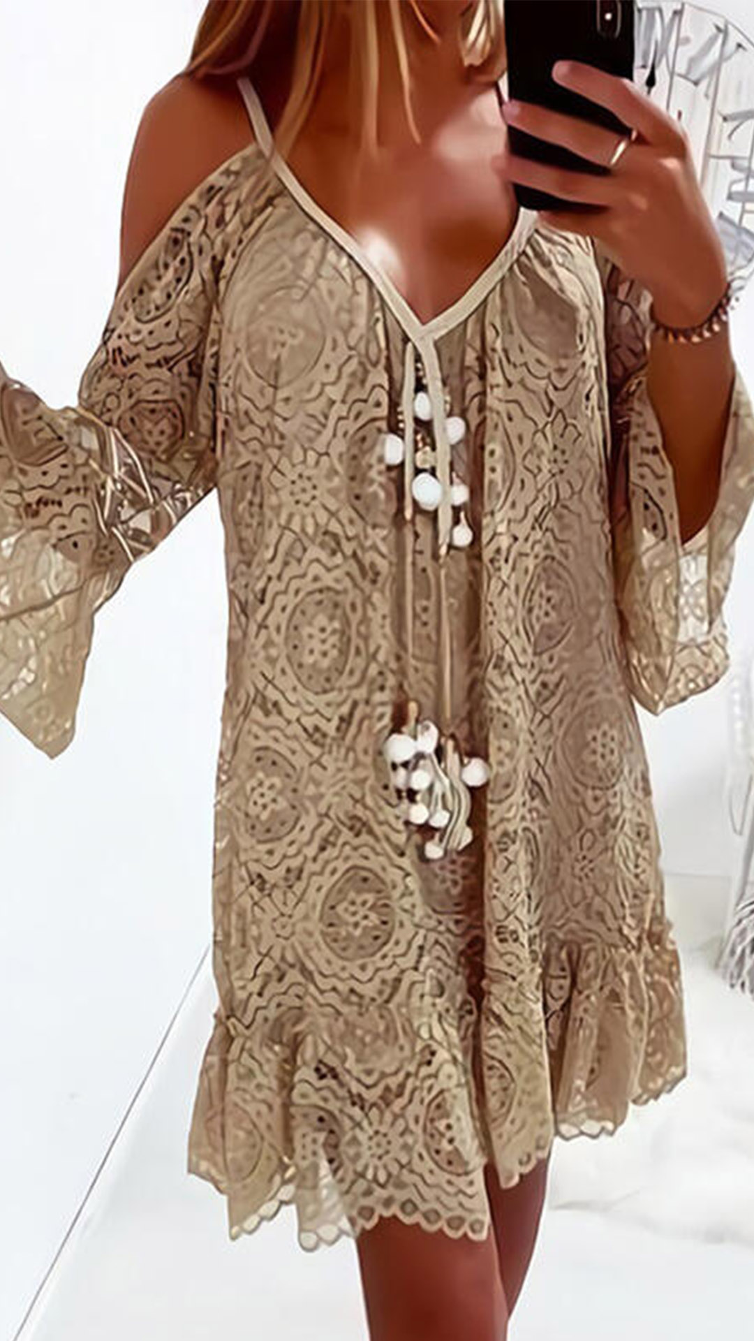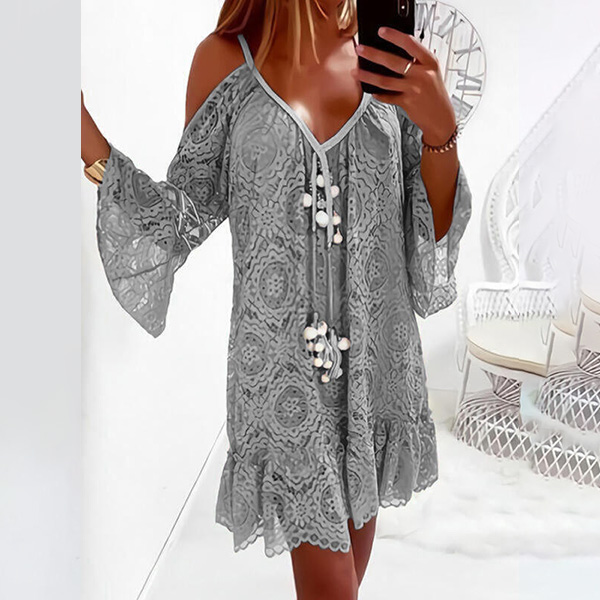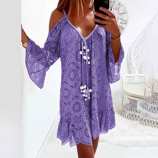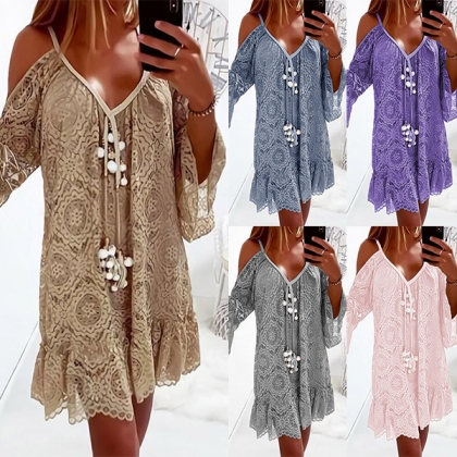 When it comes to a sweet and charming dating look,you can just throw yourself into this lace dress. Its alluring design details like off-shoulder,v-neck,trumpet sleeve and ruffle hem design can help you gain more eyes. Solid color style,the lace details will further enhance your feminine appeal. Attracted? Then buy one!