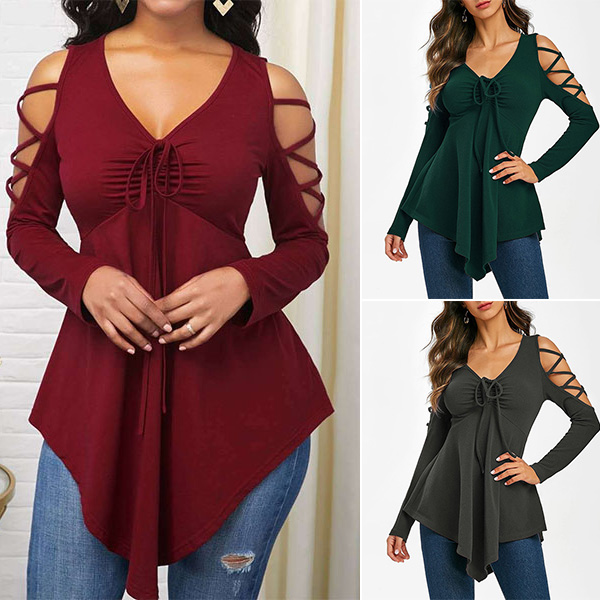 Combines of stylish and sexy vibes,this t-shirt is yearning for a place in your wardrobe. Solid color style,its distinctive and sexy design details like off-shoulder,v-neck and irregular hem will help you win more eyes. Your style can have a boost when you don this piece.