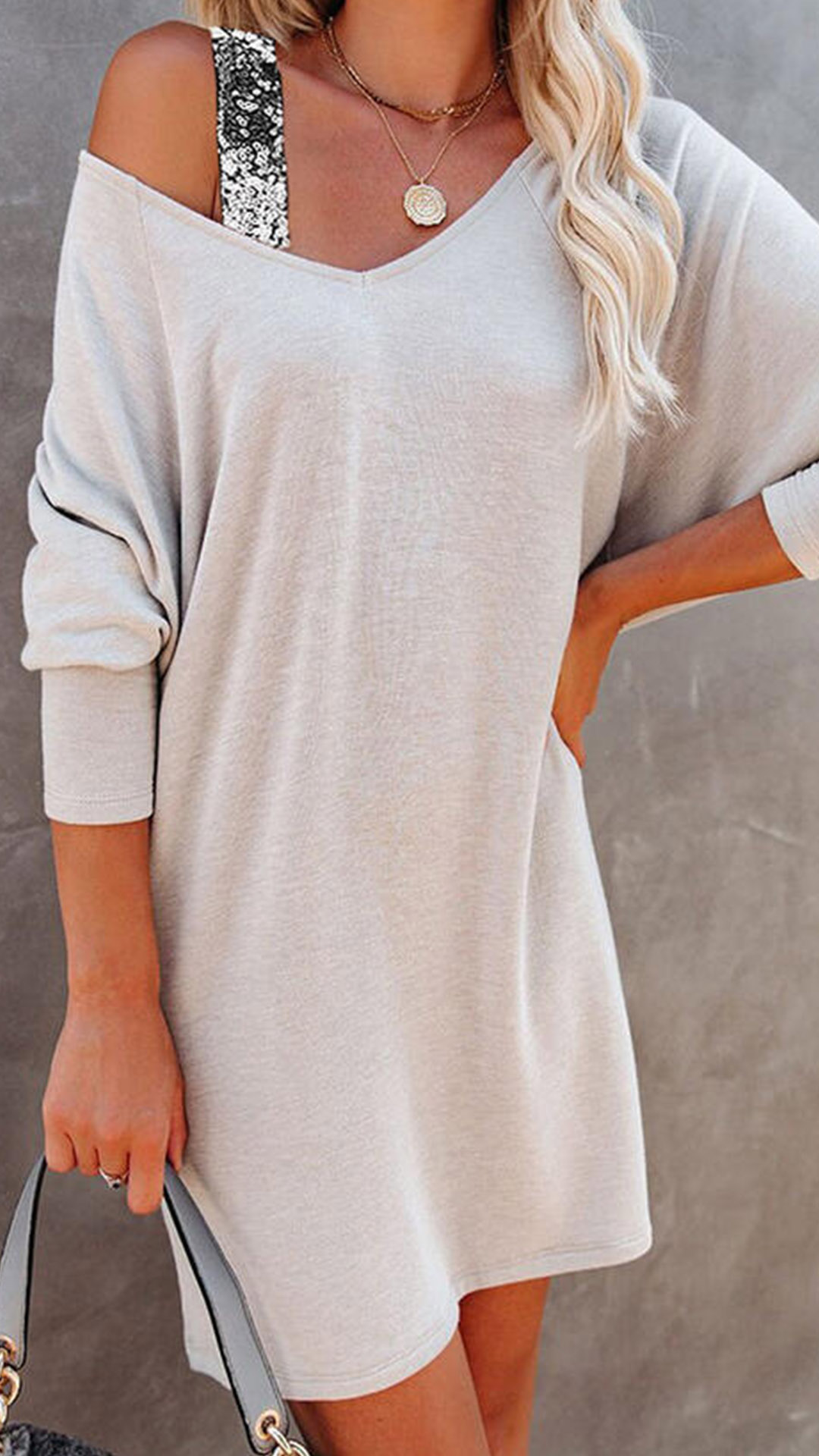 When you go out but don't know what to wear,then you can make your eyes focused on this t-shirt dress. The off-shoulder,v-neck and sequin spliced details at the shoulder part can lend you some sexy and flirty vibes. And its soft fabric,loose silhouette design can ensure you a n all-day comfort. Like it? Then buy one!
