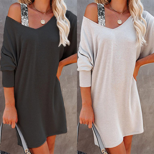 Sexy Off-shoulder V-neck Long Sleeve Sequin Spliced Sling Loose T-shirt Dress