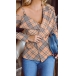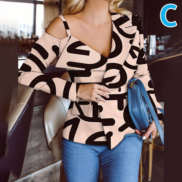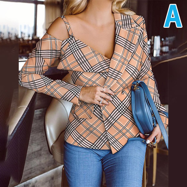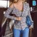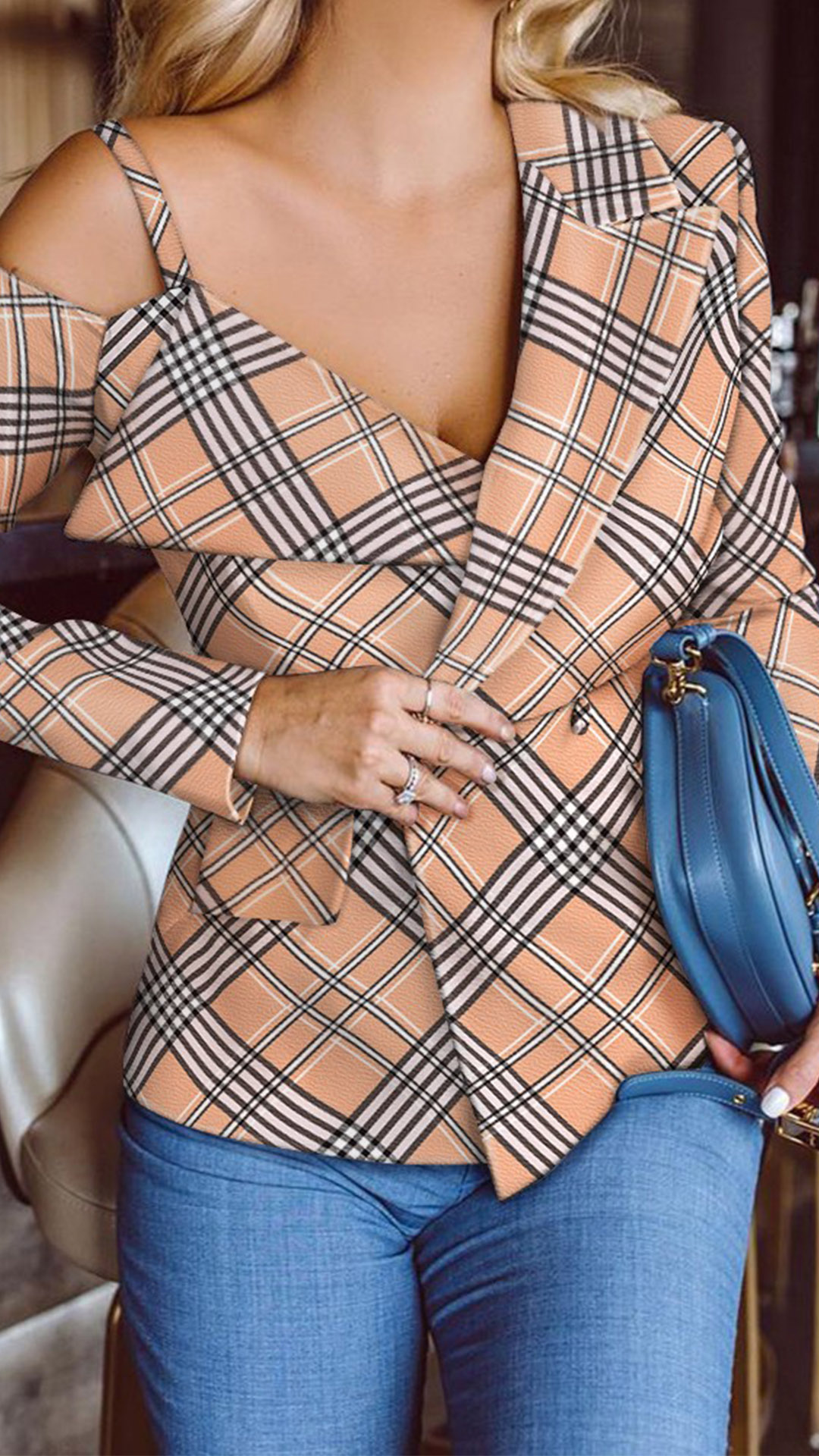 Sexy Off-shoulder V-neck Long Sleeve Slim Fit Plaid Blazer Coat