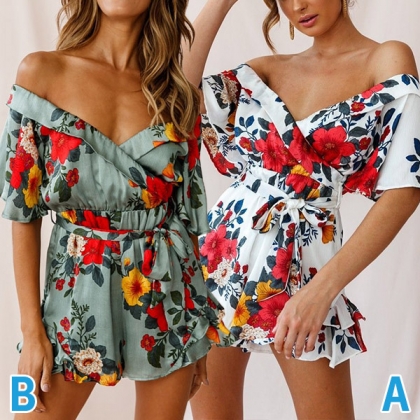 As for a sexy and charming summer look,you can just throw yourself into this romper! Features chic and eye-catching printed details,the off-shoulder v-neck and ruffle hem design can better showcase your slender figure and feminine side,while the high waist design can showcase your slender figure. For your summer days,this piece is worth to be your staple!