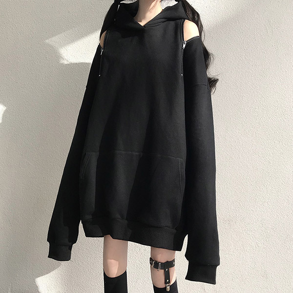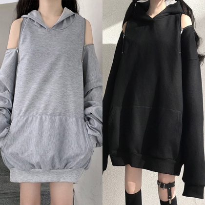 Sexy Off-shoulder Zipper Long Sleeve Hooded Solid Color Sweatshirt