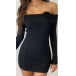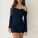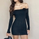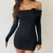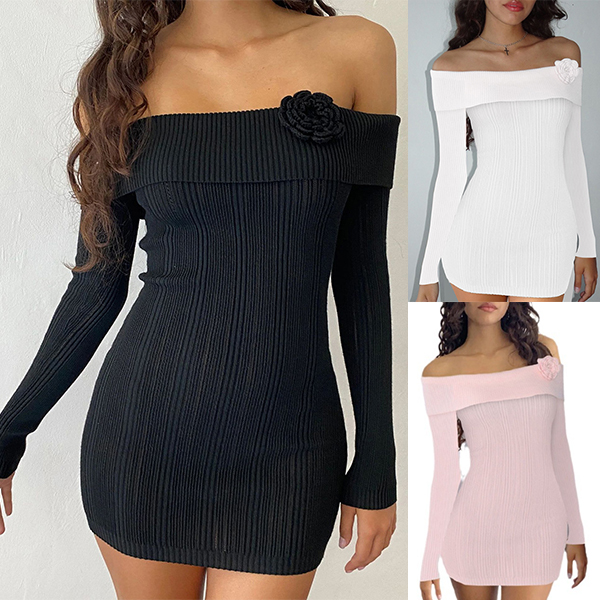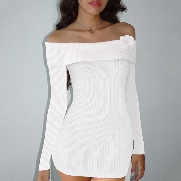 Sexy Off-the-shoulder 3D Floral Decoration Long Sleeve Ribbed Bodycon Dress