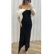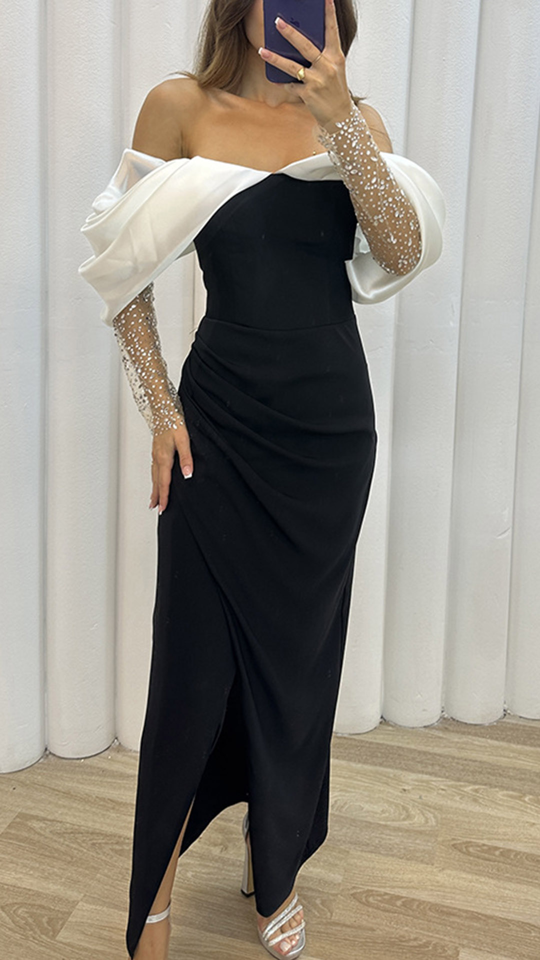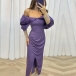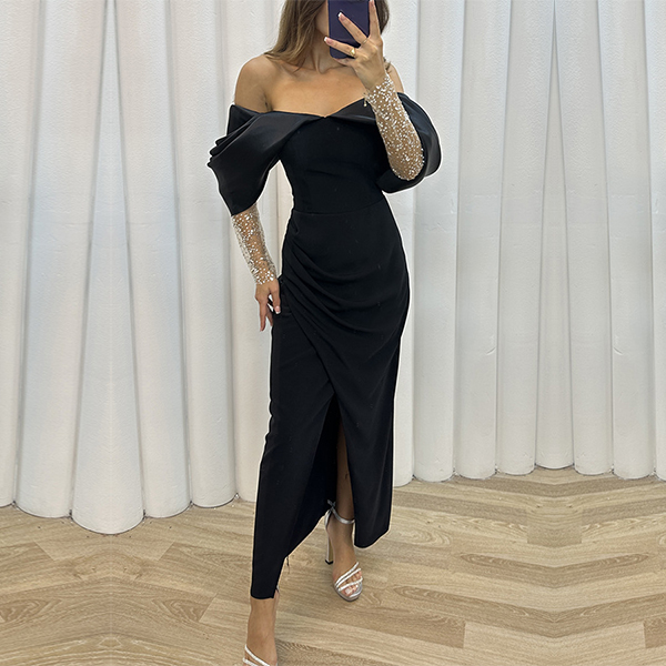 This dress is the epitome of sexiness and glamour, featuring an off-the-shoulder design, sparkling bling-bling details along the long sleeve, and a seductive slit that will make you the center of attention at any party or special occasion.