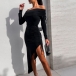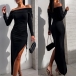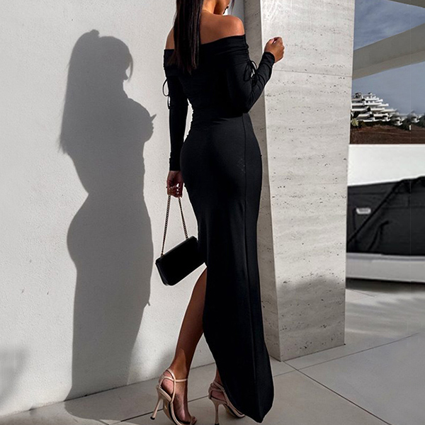 This stunning dress features an alluring off-the-shoulder neckline that highlights your shoulders and collarbones. The long sleeves add elegance and sophistication, while the side drawstring and slit detail adds a touch of sexiness and drama, making it perfect for a special event or party. The maxi length creates a flowy and elegant silhouette that is sure to turn heads.