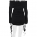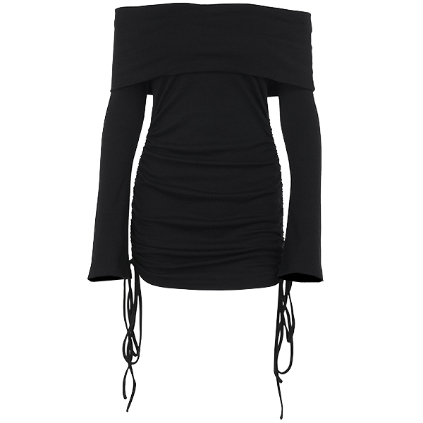 This black dress features an off-the-shoulder neckline adding a touch of femininity and allure to your look. The side drawstring detail adds a modern and trendy twist to the design. It is perfect for a night out or special occasion~