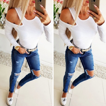 Sexy Off-the-Shoulder Long Sleeve Solid Color Top