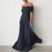 This is a stunning and alluring dress that exudes elegance and sophistication. The off-the-shoulder design offers a touch of romance and allure, while the pleated detailing adds a touch of texture and movement to the dress, creating a dynamic and eye-catching silhouette that is perfect for a special occasion or a formal event.