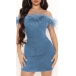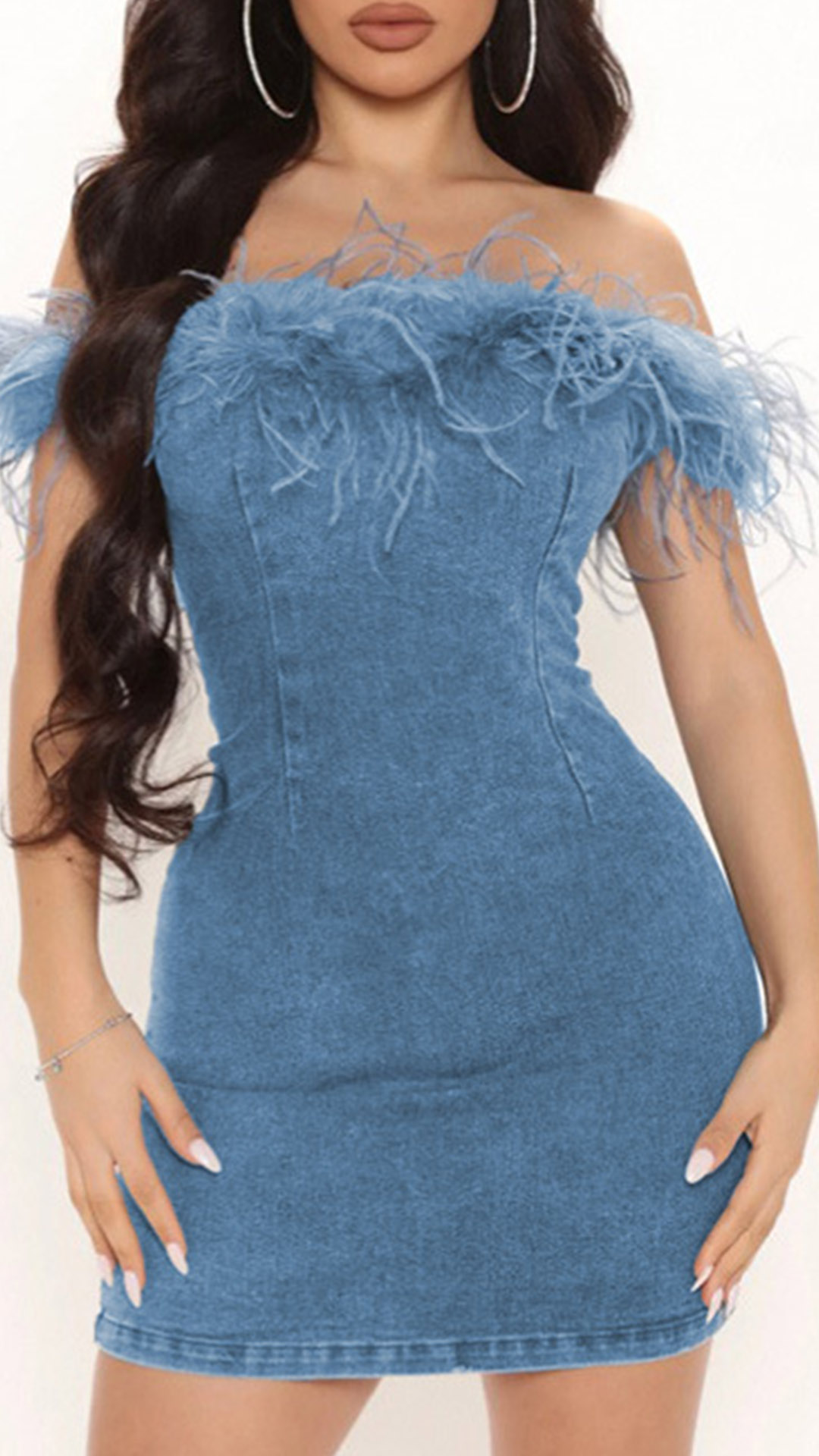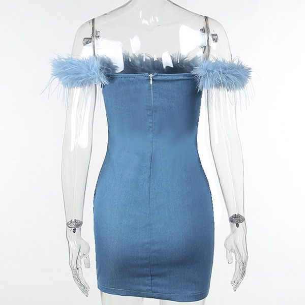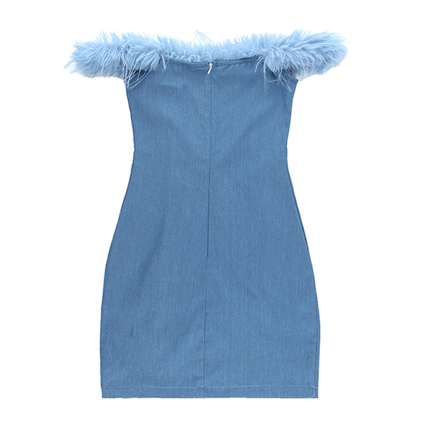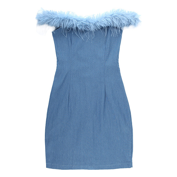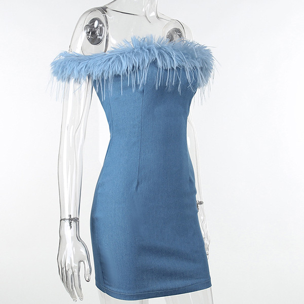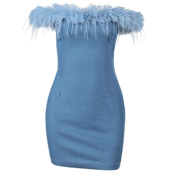 Sexy Off-the-shoulder Plush Spliced Bodycon Strapless Denim Dress