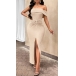 This maxi dress features an off-the-shoulder neckline, ruched details along the waist and front slit, creating a sultry and glamorous look. Pair this dress with heels and statement jewelry for a show-stopping look that is sure to turn heads.