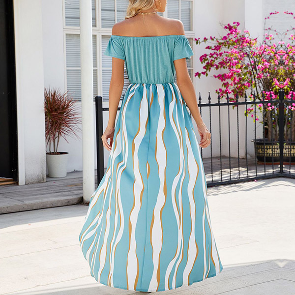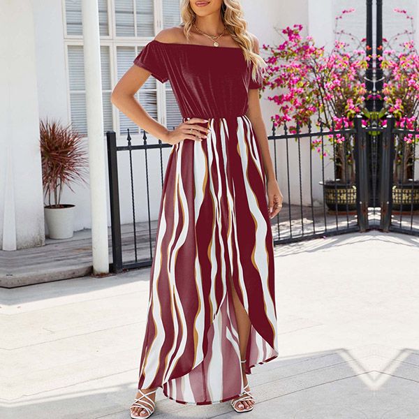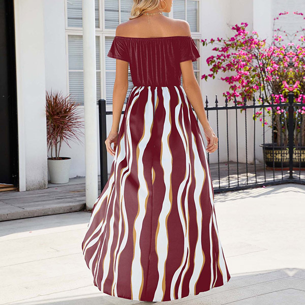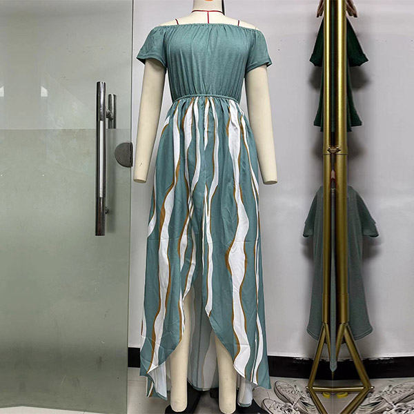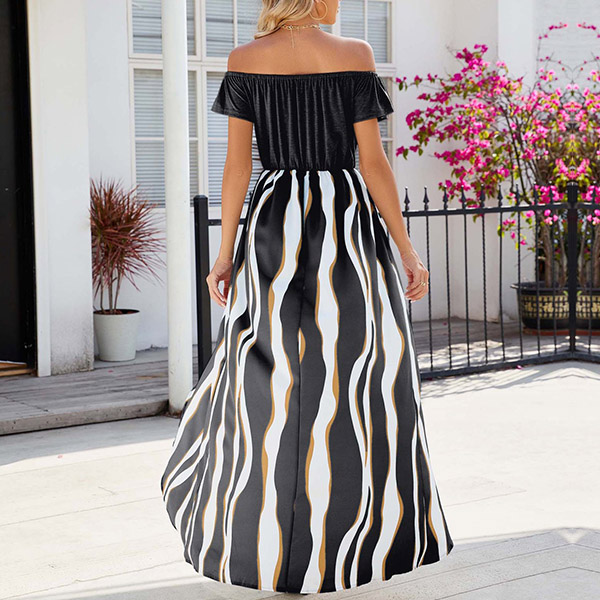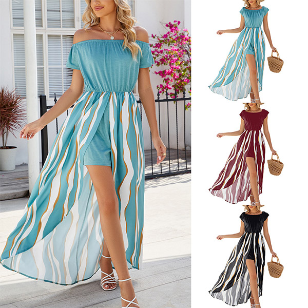 This alluring romper combines an off-the-shoulder design, short sleeves, a printed pattern, and a high-low hemline to create a captivating and fashionable ensemble. It looks like a dress, but it is a romper.