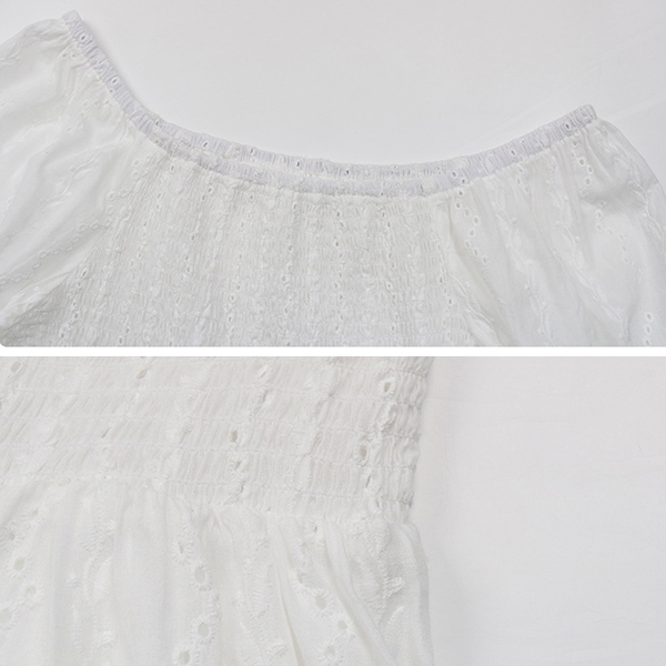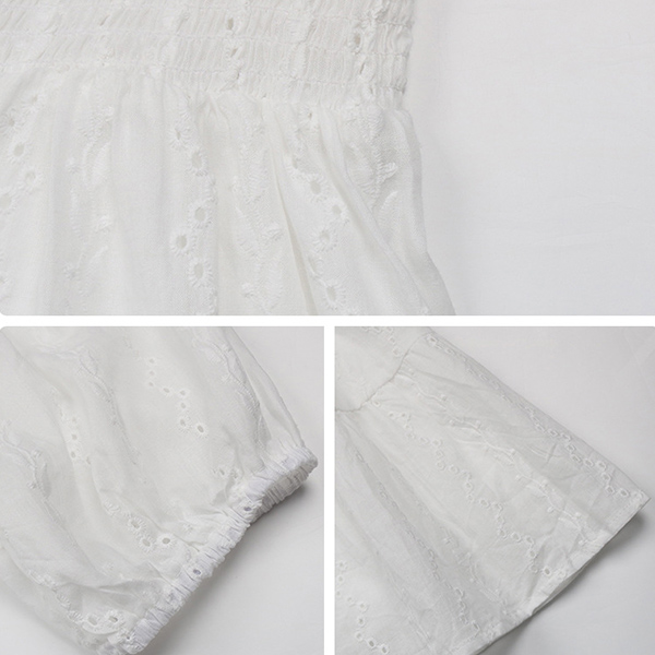 This is a flirty and stylish white dress which features an off-the-shoulder neckline, short sleeves, a smocked bodice, and floral hollow-out details for a sexy and feminine look. Pair it with strappy heels or sandals for a glamorous and chic look.