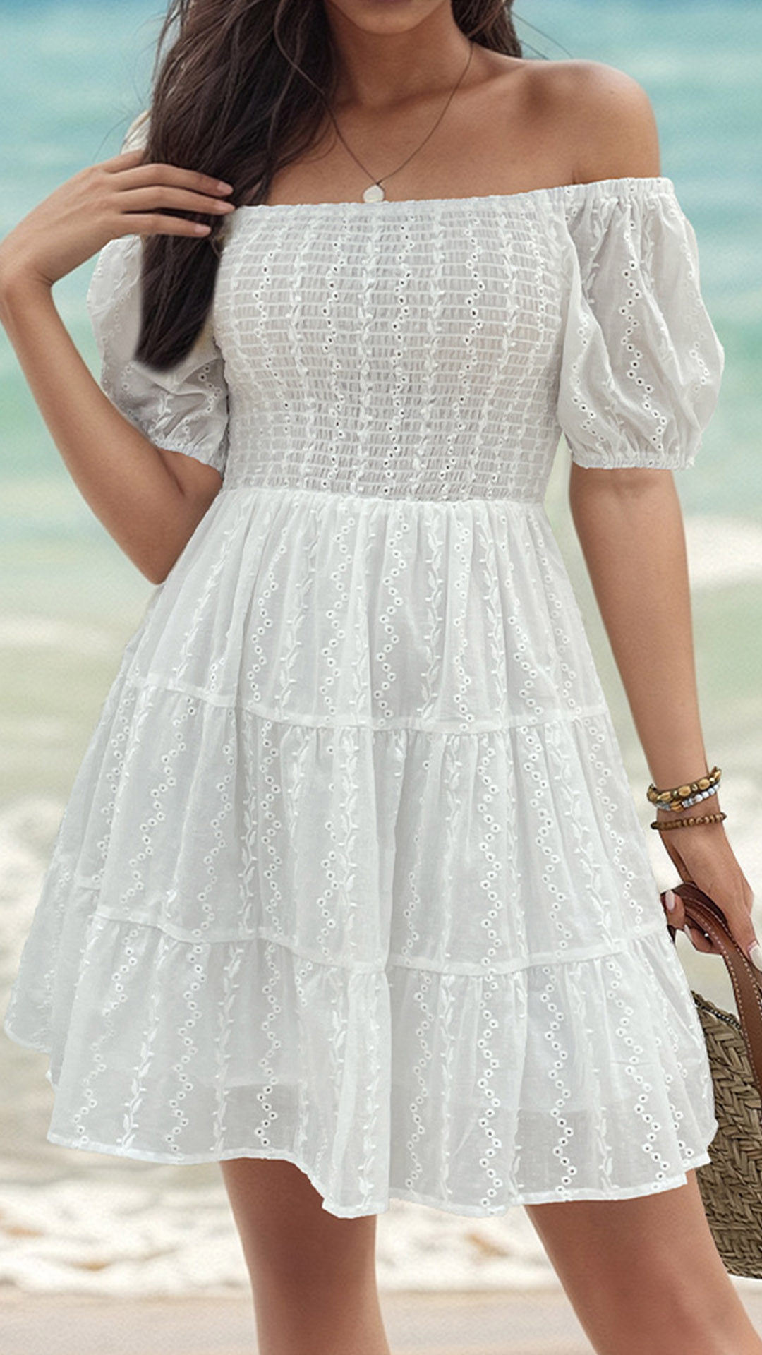 Sexy Off-the-shoulder Short Sleeve Smocked Bodice Floral Hollow Out Mini Dress