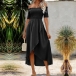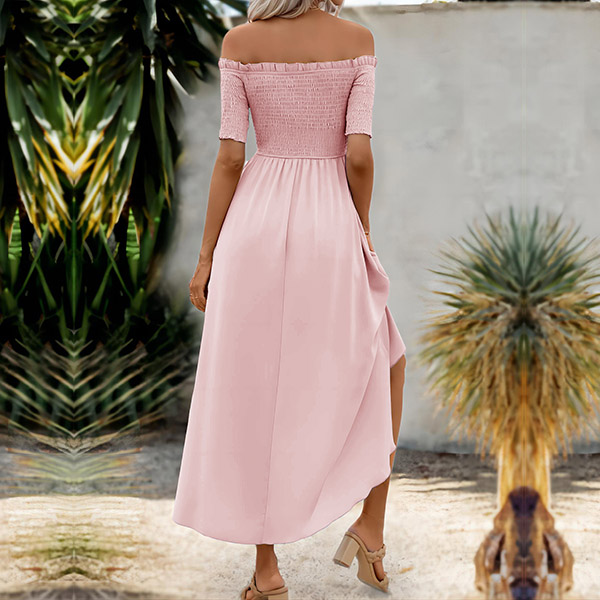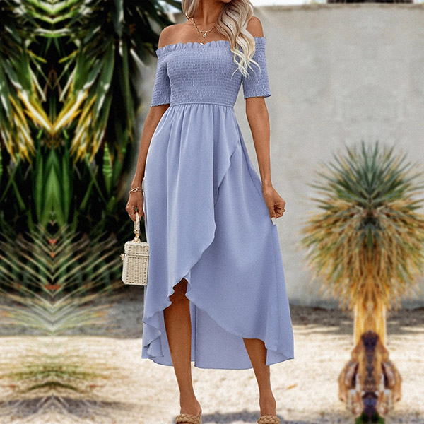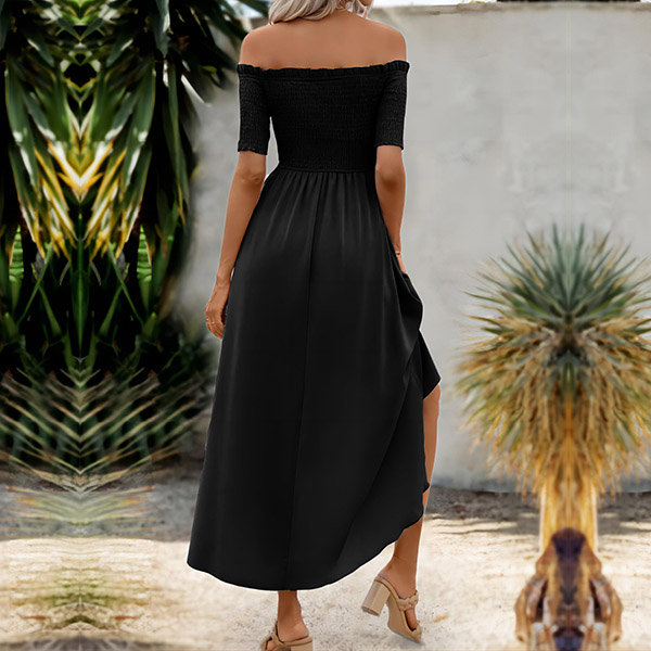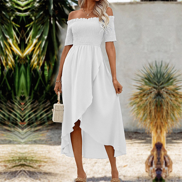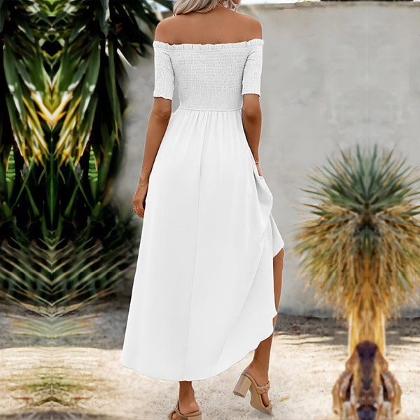 Sexy Off-the-shoulder Short Sleeve Smocked Irregular Hemline Dress