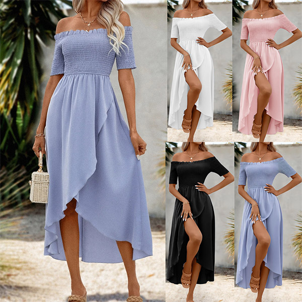 This dress features a flirtatious off-the-shoulder neckline, short sleeve, smocked bodice, and irregular hemline,it creates a playful and dynamic look that sets you apart from the crowd.