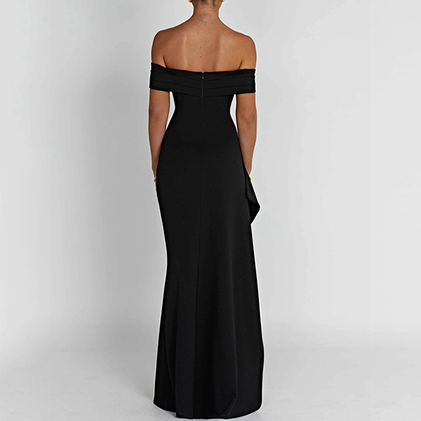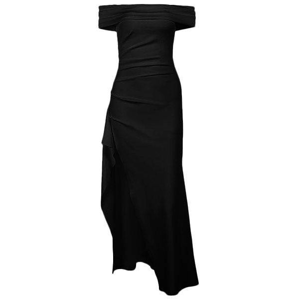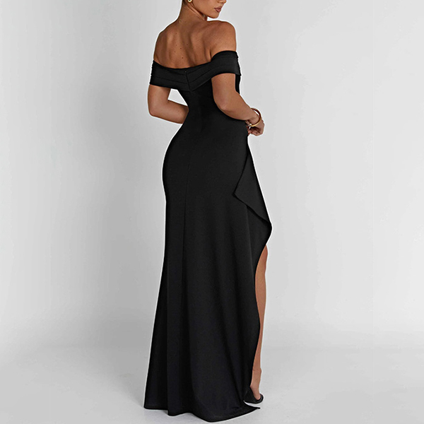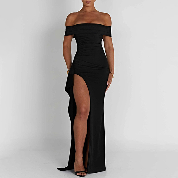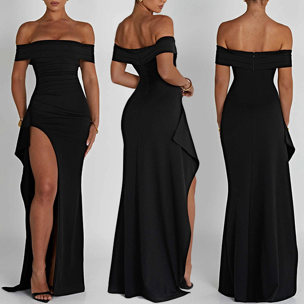 This black dress features an off-the-shoulder neckline, a high slit, and a maxi length for a seductive and stylish look. This dress is perfect for special occasions, parties, or any event where you want to make a statement.